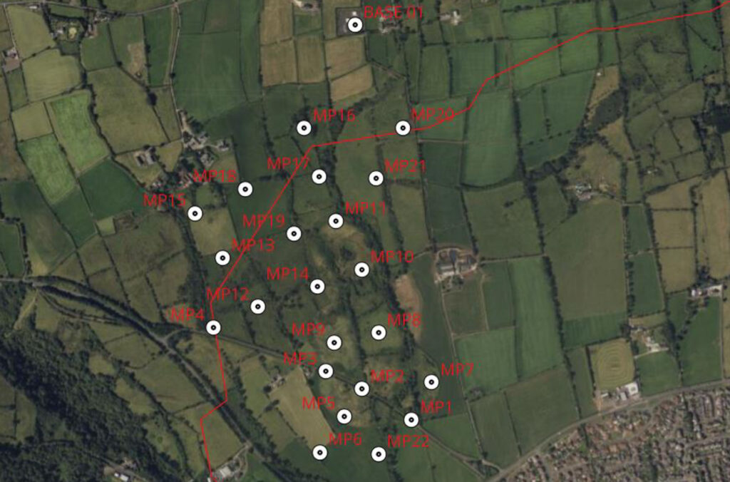 LDG Datum was provided with a map and GPS coordinates and Mark and his team positioned the twenty-two sensors at strategic locations across the sites using 550 mm screws. The base station sensor was mounted on four Kelly blocks on hard standing ground at the top of a hill.