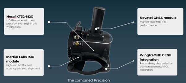 The Wingtra LIDAR sensor has 3 components: a Hesai LIDAR scanner, an inertial Labs IMU and a NovAtel GNSS.