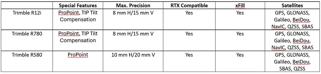They are all compatible with Trimble Positioning Services like Trimble RTX, xFill, xFill unlimited and VRS Now. (See below for more details on each service)