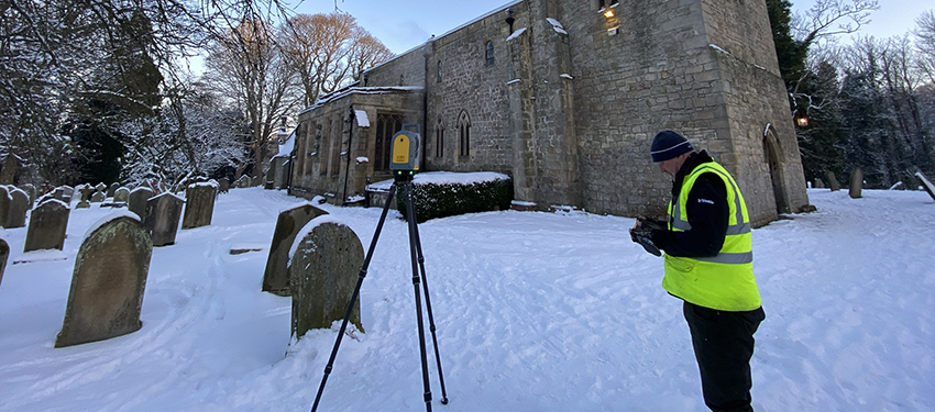 On completion of the job, Lee reported that he spent just one snowy day on site along with his colleague AMR Geomatics Technical Manager, Mark Hudspith. Whilst Mark carried out the topo survey, Lee used the X7 for the internal and external scan work. In all, around one hundred scans (either four or seven minutes long) were undertaken along with the relevant imagery. This included work up in the bell tower where Lee found the handle of the X7 invaluable in getting it up a vertical ladder and manoeuvring it within the confined space. Once in the tower, the scanner was positioned on steel beams assisted by the built-in self-levelling technology.