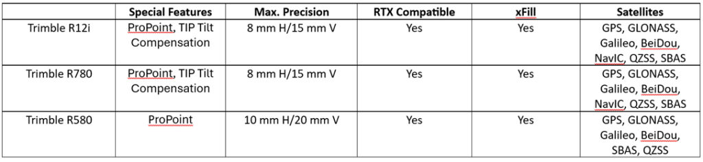 All three models support Trimble RTX corrections, both via L-band (satellite) broadcast and over the internet.